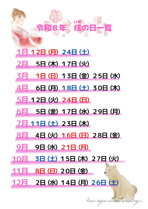 妊娠五ヶ月ごろ子宝に恵まれたことに感謝し、母体の安全と無事な出産を願います。犬の安産にあやかるため戌の日が選ばれますが、都合の良い日にお参りされても受付します。