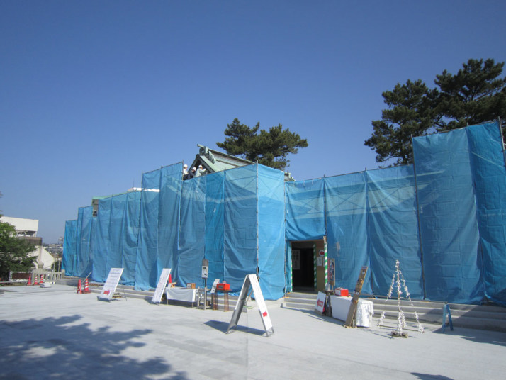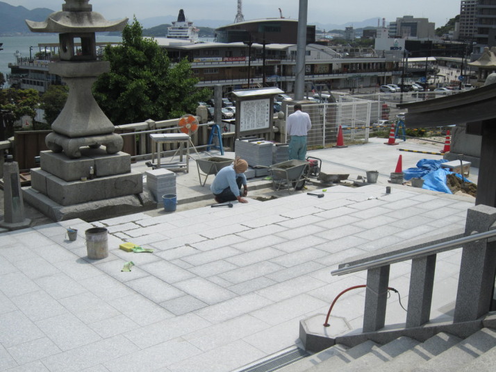 境内整備事業(5/8〜5/27 撮影) 授与所の外壁塗り替えが始まりました。 石畳舗設の工事もいよいよ大詰めです。 ご神苑を囲む外壁の補修と塗り替え、酒井商店屋上の展望台灯籠補修、飾り金具の取り付け工事など、仕上げ作業が続きます。、 |