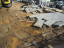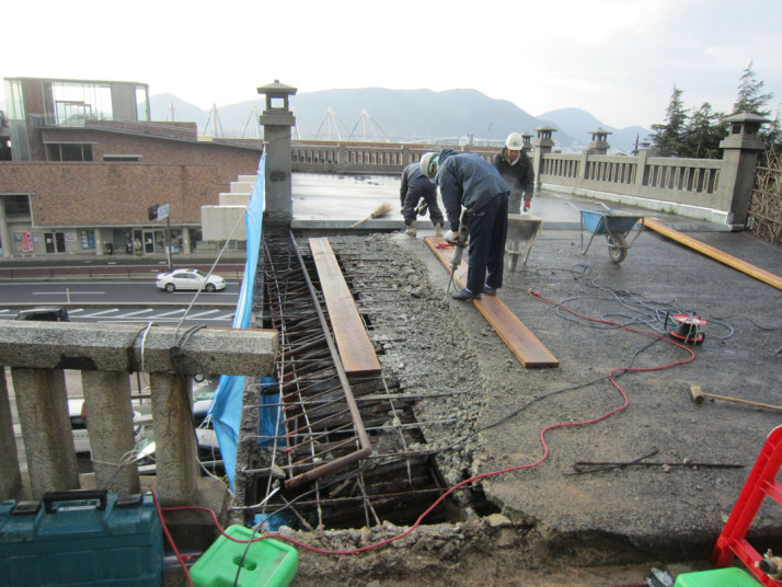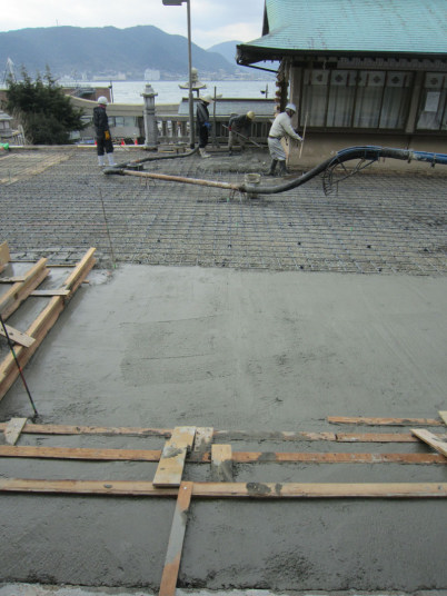 境内整備事業(2/18・2/19 撮影) 酒井商店屋上の展望台へ続く人工地盤の撤去作業が始まりました。コンクリートを剥いでゆくと、老朽化がより分かります。 参拝者の通行確保のため、先ず半面を生コンで固めます。 御拝所前の人工石の石畳、階段も剥がしていきます。度重なる造営の跡が見えてきました。 |