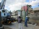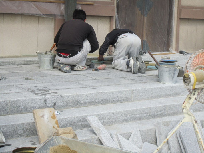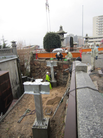 境内整備事業(2/23・2/24 撮影) 大型のクレーンで、人工地盤の鉄骨を撤去。 石材店の作業も始まりました。何百年も揺るがないきれいな石畳にと、職人さんの綿密な計算のもと、作業が進められます。 |