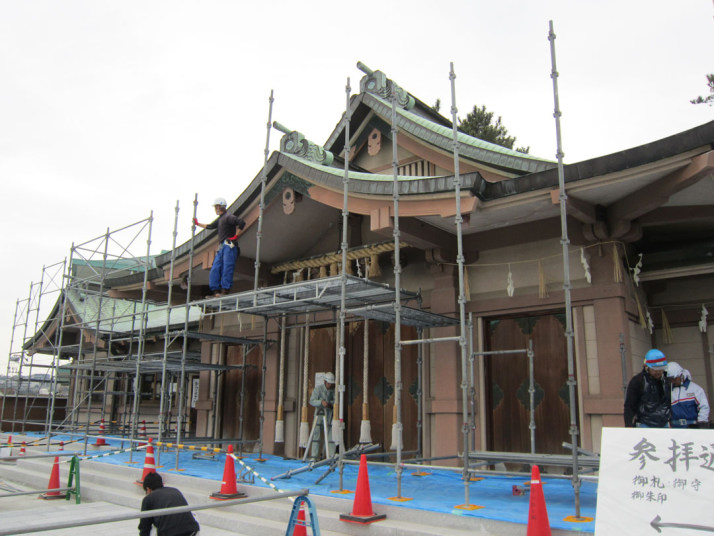 境内整備事業(3/28〜4/2 撮影) 社殿外壁塗装工事が始まります。 |